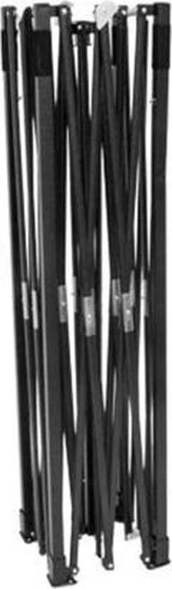 Het frame van de Easy up luxe is een harmonicasysteem en heeft metalen, plooibare buizen van 30mm dik. Het frame bestaat uit vier hoekpalen, gekruiste buizen aan de binnenkant en aan de buitenkant en een nokpaal. Deze buizen hebben op de hoeken een ‘kliksysteem’ waarmee jij de tent op de gewenste hoogte vast kunt klikken. Het frame heeft vier verschillende hoogtes waarop je het frame vast kan klikken, het pop-up systeem is gemakkelijk uit te klappen Op deze manier kun je binnen één minuut een complete partytent hebben staan. Zélfs als je de tent in je eentje gaat plaatsen, ben je binnen een mum van tijd klaar!
