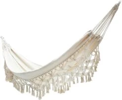 Dit artikel komt in gebroken wit. Het doek bestaat volledig uit katoen en heeft een draagkracht van 250 kg. De totale lengte van de hangmat is 280 cm, het liggedeelte is 180 cm lang en 150 cm breed.