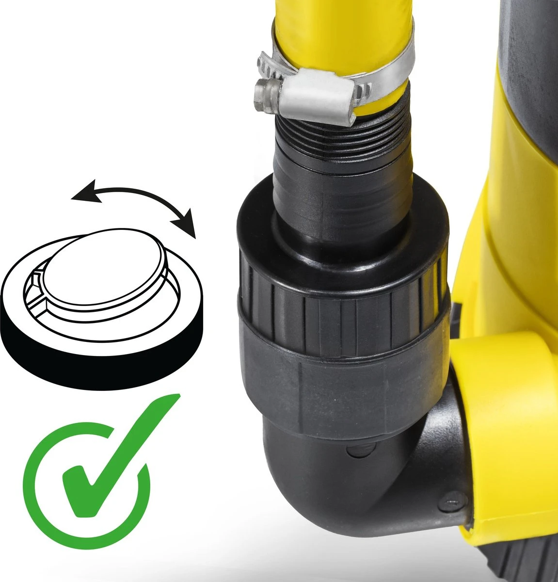 De stabiele ergonomische draaggreep maakt het transport in de tuin of naar elke andere plaats makkelijker en verbetert het gebruik van het compacte apparaat. Hij dient bovendien als ophanging van de pomp aan het meegeleverde nylontouw, om ze bijvoorbeeld in het zwembad naar beneden te laten. Universele aansluitingen aan de hoekadapter voor 25 mm en 32 mm binnendiameter net als 1‘‘/ 1¼‘‘ und 1½‘‘ schroefdraadaansluitingen maken een koppeling met verdere slangverbindingen zonder problemen mogelijk. De hoekadapter laat zich verstellen, zodat slangen en leidingen ook paralel met de grond kunnen lopen. Het 10 m lange snoer biedt flexibiliteit en een grote gebruiksradius.