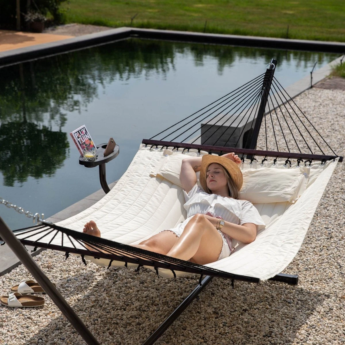 Stabiel, veilig en mooi. De standaard van de hangmat is gemaakt van een gepoedercoat stalen buis en biedt een stabiel ligvlak. De hangmat is weerbestendig en de beschermkappen zorgen ervoor dat de vloer niet bekrast raakt. Het frame is gemakkelijk te monteren zonder gereedschap. Vanwege het lage gewicht van het frame kan deze eenvoudig worden verplaatst. De dwarsbalken van hardhout garanderen een stabielere ligpositie dan conventionele hangmatten.