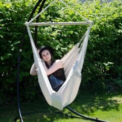 Daarom is onze luxe hangstoel ook uitgerust met een gigantisch stoffen oppervlak – zelfs grote volwassenen kunnen zich hier volledig uitrekken.